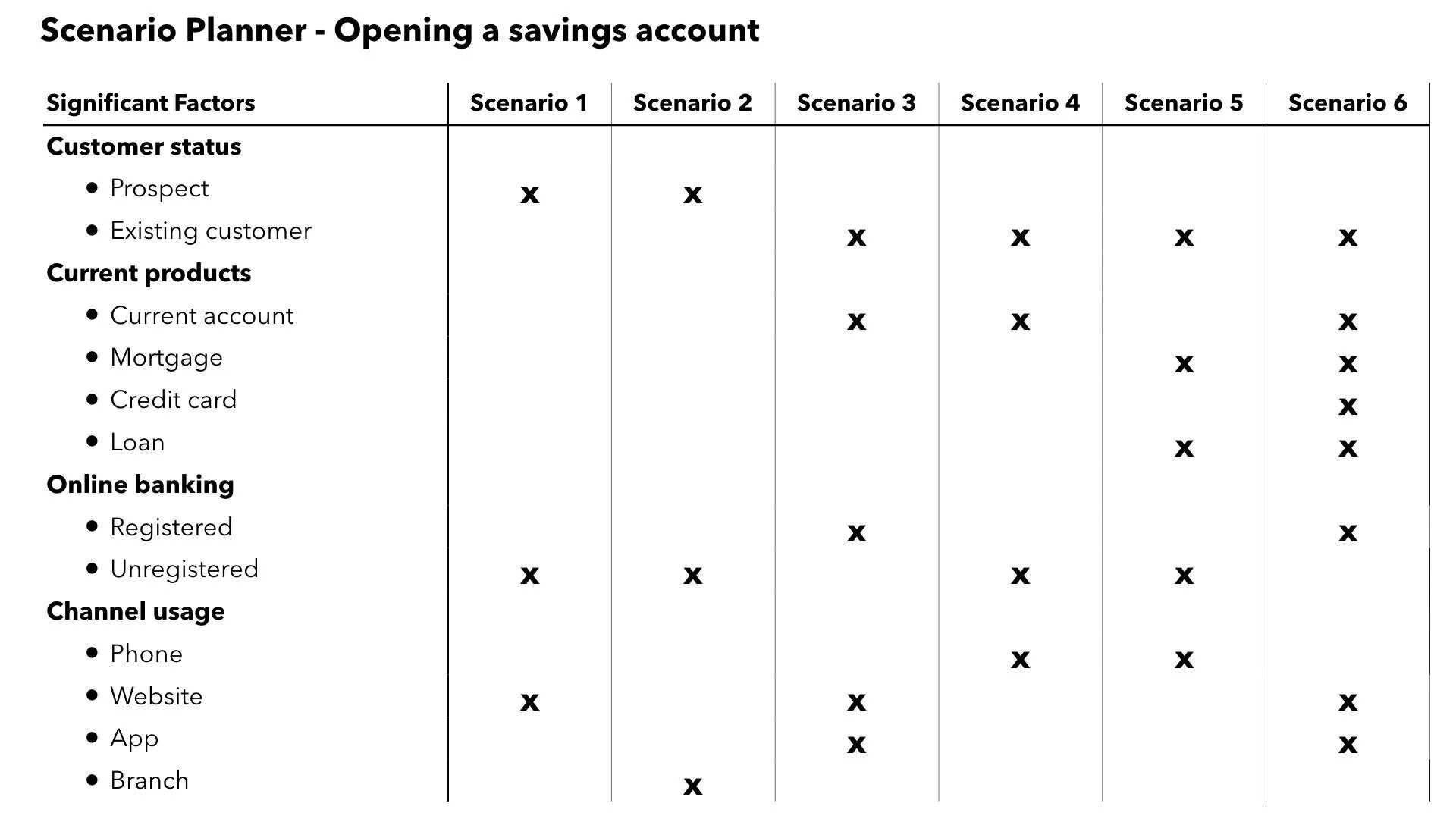 1: Brainstorm a list of significant factors relating to your customers or their scenario. This can be anything: their goal, their expertise level, the existing products and services they use, the channels available to them, whether they're a new or repeat customer, etc. There are no rules - just try to capture every relevant factor in the rows of a spreadsheet (see pic).